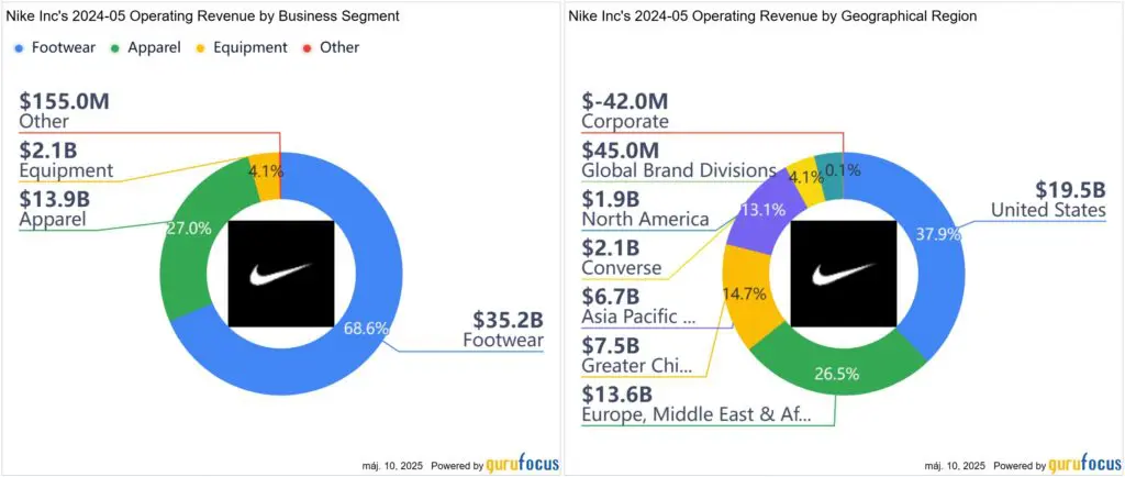 Cipők és egyéb ruházati termékek: a Nike Inc. (NKE) a bevételeinek kétharmadát a cipőivel termeli, ami nagyjából 30 milliárd USD volt 2024-ben, míg 17 milliárd USD volt a többi ruházati termék. A nagyobb marzs szintén a cipőkön van, ezért ezeket a bevételi adatokat is közelről kell követni.