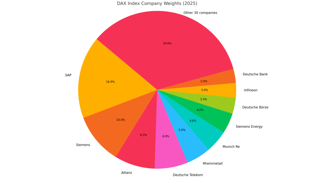 Nem sorolom fel mindegyik céget, amit a DAX index tartalmaz, de érdemes tudni azt a néhányat, amelyik igazán uralja az indexet, 2025 közepi állapot alapján.