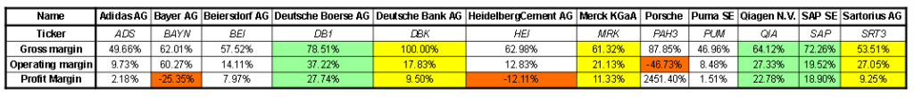 Pont ezt tettem, és 28 vállalat egyből ki is esett az értékek alapján, persze nem kell mindenkinek annyira szigorúan meghúzni a határt, mint ahogy én tettem. A maradék 12-nél ahol negatív értéket láttam, azt egyből kiszórtam, igaz a Porsche – PAH3 – megérne egy konkrét ránézést, mert ott valamilyen anomália van az értékekkel. Sárgával jelöltem a közepes vállalatokat, viszont ezeken felül is találtam 3 olyat – Deutsche Boerse (DB1), Qiagen N.V. (QIA), SAP SE (SAP) -, ami második ránézésre sem tűnik rossznak.