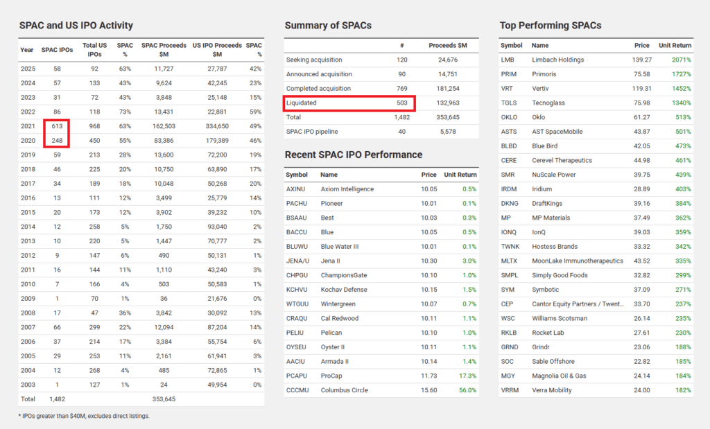 Betettem a 2025 júniusi állapot szerint képet is, vagyis az elmúlt 4 év változásait, amin bejelöltem két területet. Az egyik azt láthatjátok, hogy 2021 vége után, mikor abbamaradt a pénznyomtatás a piacon, eltűnt a kockázati tőke, és leesett a SPAC-ok száma, de egyébként az IPO-k száma is. A másik a csődbe ment és a tőzsdéről törölt SPAC vállalatok számát láthatjátok. Ez egy nagyon kockázatos, spekulatív forma, szerintem nem kisbefektetőknek való.