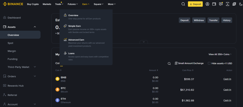 Binance központosított tőzsde (CEX) felülete