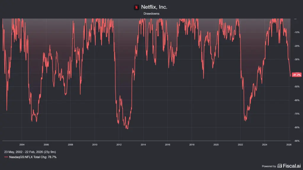 A Netflix árfolyama 2026-ban közel 18%-ot esett a csúcsokhoz képest, míg az all time highoz képest már -41%-nál jár a papír, ami meglepőnek tűnik egy olyan vállalatnál, amelyik 2025-ben minden pénzügyi célkitűzését teljesítette vagy túlszárnyalta. A piac azonban egy dologra reagált: a Warner Bros.-felvásárlásra. Az üzlet bejelentésekor a részvény azonnal meredeken esett, a befektetők megrettentek az 90 milliárd USD-s becsült felvásárlás utáni adósságterheléstől, az 5,8 milliárd USD-s lemorzsolási díjtól (breakup fee), amelyet akkor kell kifizetni, ha a regulátorok blokkolják az üzletet, valamint a hollywoodi szakszervezetek és mozitulajdonosok ellenállásától.