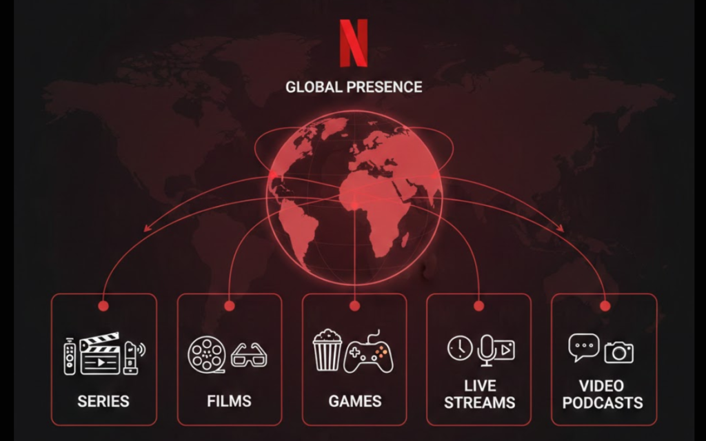 [📸 IDE KÉP: A Netflix globális jelenléte és főbb tartalomkategóriái – sorozatok, filmek, játékok, élő közvetítések, videópodcastok – infografika stílusban, sötét vörös-fekete Netflix-palettán]