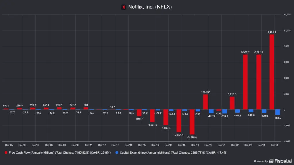 A szabad cash flow szintén meredeken emelkedett: 2023-ban 6,9 milliárd, 2024-ben szintén 6,9 milliárd, 2025-ben pedig 9,5 milliárd USD, ami 36%-os éves növekedés. Ez azért különösen fontos, mert a Netflix (NFLX) üzleti modellje alapvetően különbözik a klasszikus CAPEX-intenzív iparágaktól: a tartalmak előállítási költsége (content spending) nem CAPEX, hanem működési kiadás, a tényleges infrastrukturális tőkeberuházás (épületek, szerverek) csupán évi 688 millió USD volt 2025-ben.